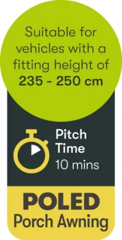 This model has been produced from a premium ultra-lightweight 120HDE fabric weave, which has been specifically engineered to deliver lightweight, compact and visually contemporary products that pack away neatly into the inclusive carry bag, making it perfect where weight or space limitations are of key consideration. This material incorporates a 3,000mm Hydrostatic Head and employs fully taped seams throughout, meaning it is exceptionally waterproof and rain will simply bead onto the surface, before rolling off. The sleek design lines & classic tricolour livery will coordinate & complement any campervan or motorhome.
