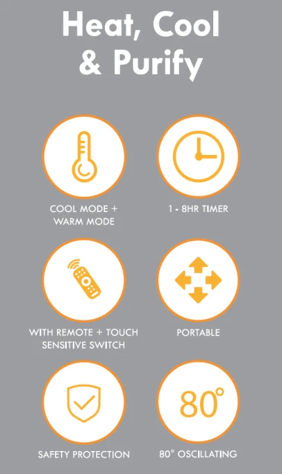 Think of a product that can both heat and cool you down, depending on the seasons. The Sahara Heat Cool Pure is that exact product. With a variable thermostat, the electric heater produces comforting warm air. This fan heater is portable so that you can use it in any room in your house. Are you feeling too hot? Feel a refreshing flow of purified air when you switch the electric fan to cooling mode.