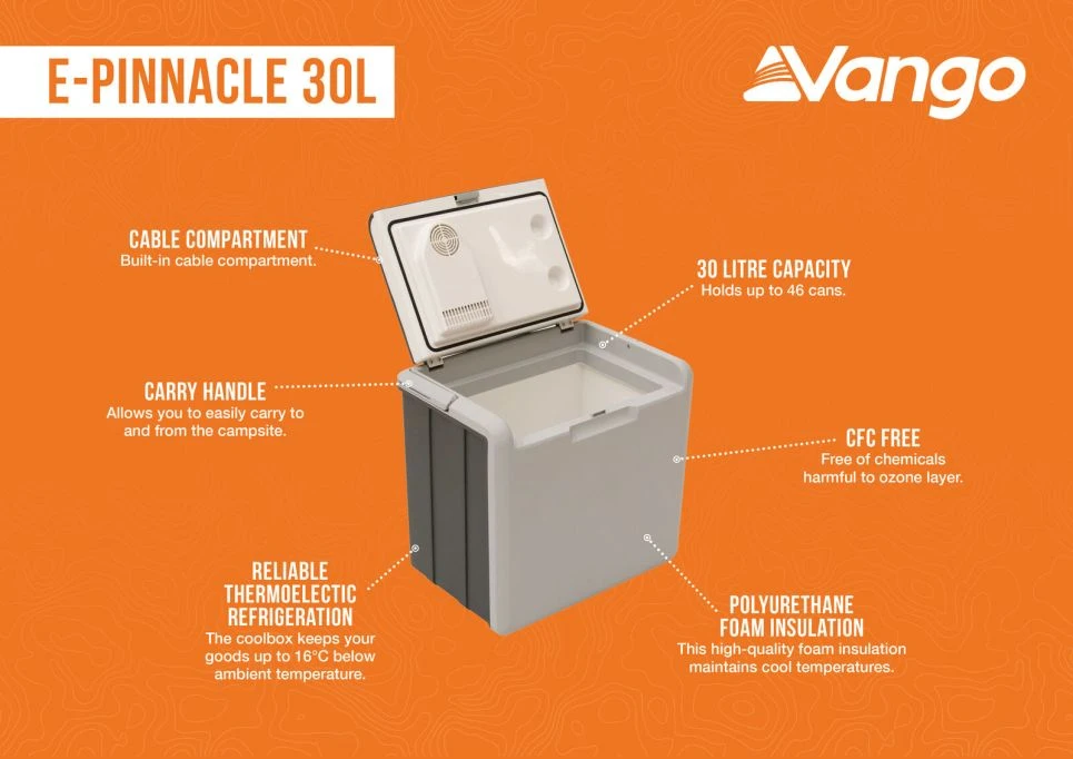 The Vango E-Pinnacle 30 litre mains and 12V electric cool box can be powered either from AC -230V mains or by a DC -12V in car socket. The cool box is able to cool up to 16 degrees C below the ambient temperature ensuring that your food and drink supplies are kept cool even on a warm day.